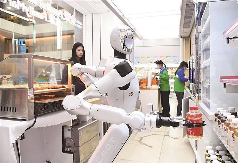 近日,一款具身大模型机器人进驻北京市海淀区中关村大街一座大厦内的便利店,开启常态化服务。据了解,该款机器人可以在便利店中完成迎宾互动等揽客接待需求,还可以自主完成冷饮、熟食等商品的取放与递交,助力提升顾客购物体验。图为4月22日,机器人为顾客抓取饮料。新华社记者 任超摄(任超)